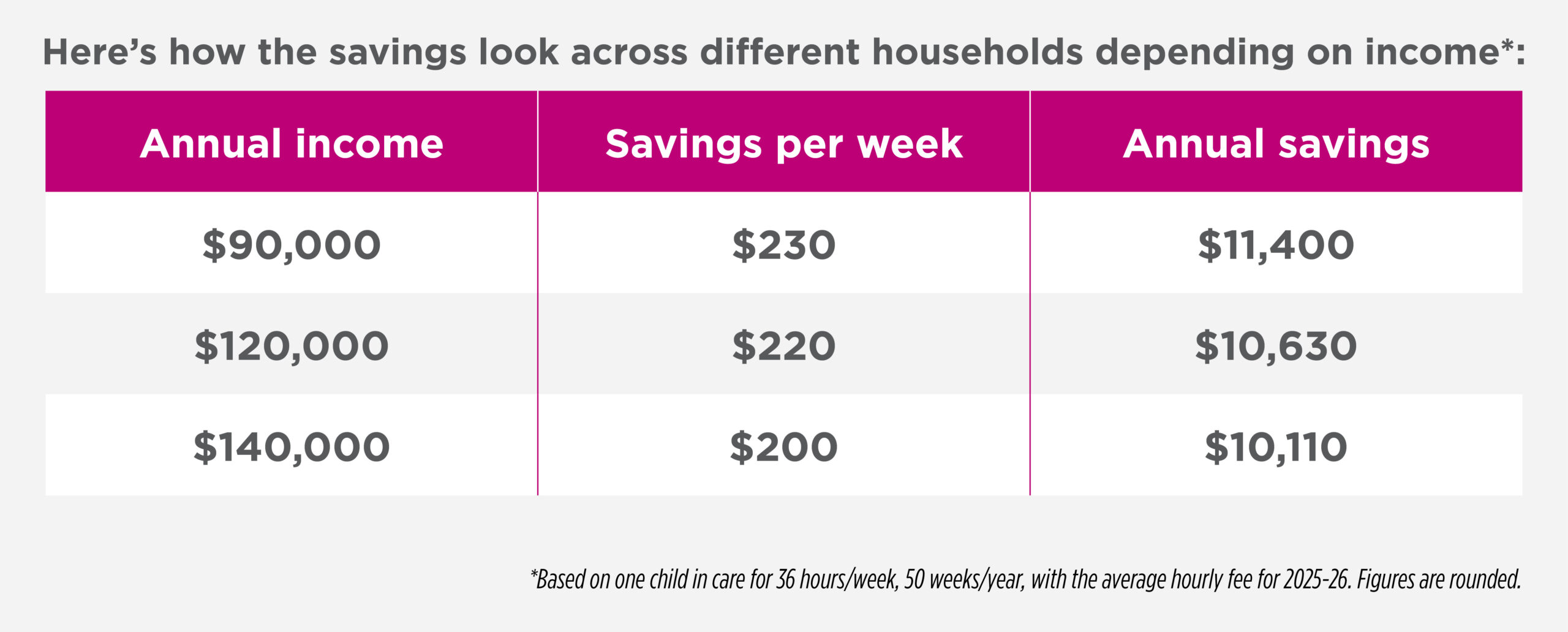 For example, Diane and Alex have one child enrolled in care three days (36 hours) per week. Their combined family income is $90,000 per annum. Diane works full-time and Alex works eight hours per week. Previously, they were eligible for 18 hours of subsidised care per week. From January 2026 with the Three Day Guarantee, they are eligible for 36 hours per week. This saves them $230 per week of care ($11,400 per year) based on 2025-2026 average fees.